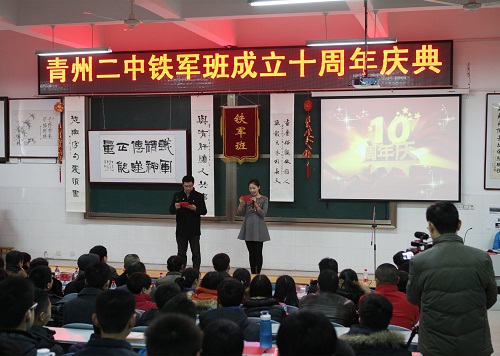 山东省青州第二中学是市属重点普通高中,始建于1952年,学校故址,明万历间为“云门书院”。青州二中秉承“质量兴校,名师兴校,科研强校”的办学理念,不断强化内部管理,精心打造名师队伍,高考成绩一直稳居同类学校前茅,在潍坊享有广泛赞誉。“铁军班”更是异军突起,要求每一位“黄金战士”具有“铁的脊梁,钢的意志,军人的纪律,过硬的学习成绩,各项活动的排头兵”的素养。2013年是铁军班发展史上永远值得纪念的日子。正月初七,“铁军班”在学生首届班长丁昌宇倡议下在青州万荷大酒店成立了“铁军班”理事会。同年,11月22日,铁军班一二三四代学生的部分家长代表在青州二中家长委员会学校进行了热烈的讨论,成立了以陈伟杰为会长,贾炳忠为董事兼秘书长,吴连江、陈志营、崔建军、裴德修、王建秀为董事的“铁军班”董事会。