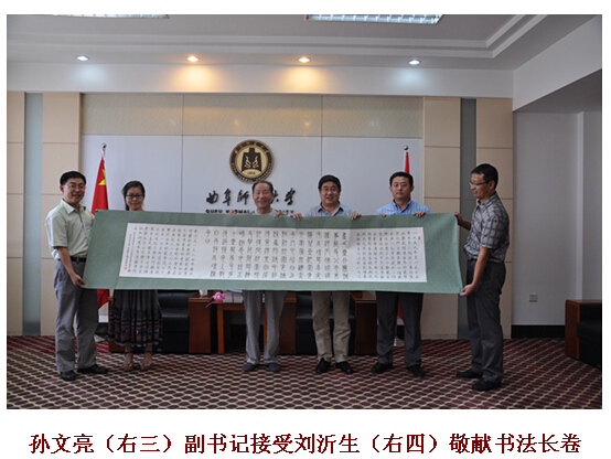 金秋八月十二日,阔别母校五十一载的刘先生,携儿子、儿媳及孙女刘雪莲重返曲师大,为曲师大六十年校庆献上书法长卷与他的六部作品。刘沂生是曲阜师大的著名校友,受到母校副书记孙文亮、校友办主任刘建河、师大校报社主任宋广新及十四届英语新生辅导员曲凤东等领导的盛情接待。