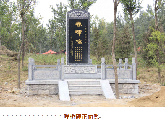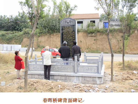 春晖桥碑,于2016年9月29日隆立。设计新颖,端庄古朴,恢弘大气,坐落于桥东头北侧,为春晖桥平添一道靓丽光环。桥碑正面桥名,由我市书法家宋执贵先生赐宝;颂诗题吟,由八旬翁刘沂生先生撰句。