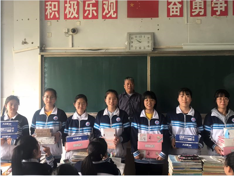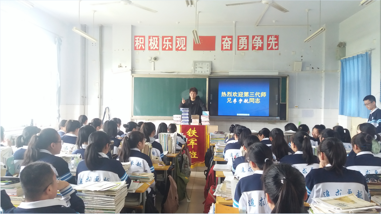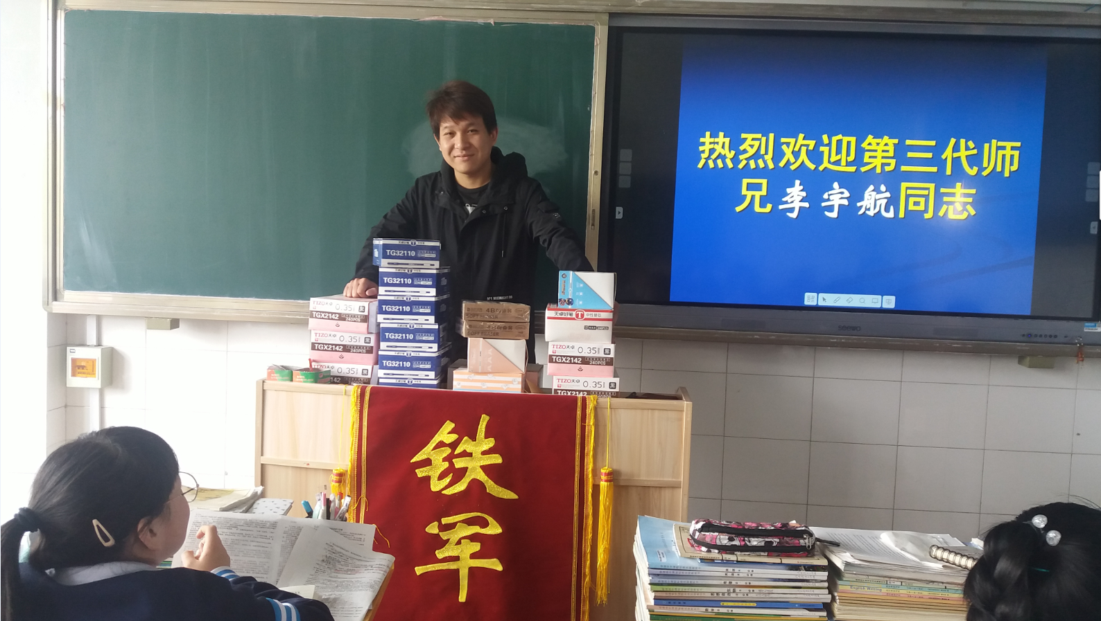 2019年5月4日上午课间操,铁军班班徽设计者李宇航同志到母校向学弟学妹举行了捐助活动。